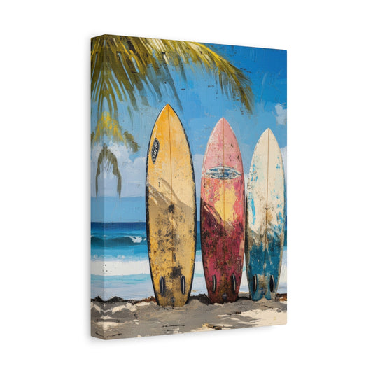Planches de surf vintage sur une plage tropicale - Décoration murale sportive
