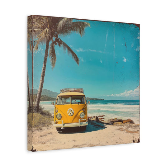 VW jaune vintage sur la plage – Art mural rétro
