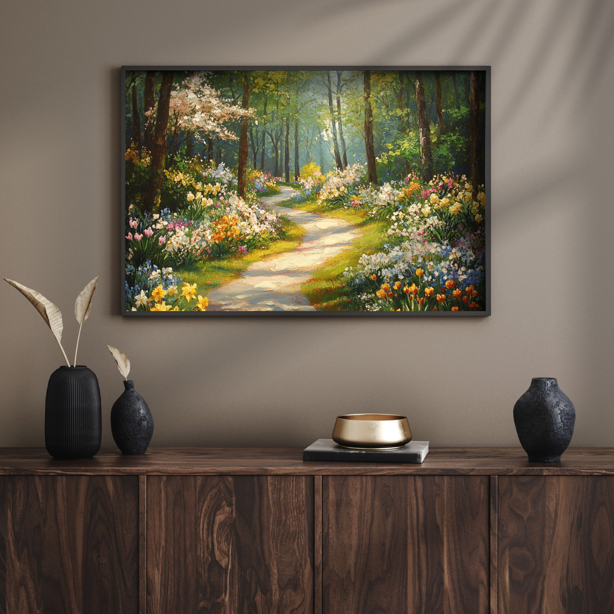 Transform your space with the timeless beauty of the Serene Spring Forest Pathway. This captivating nature-inspired piece transports you to a sunlit forest path, flanked by vibrant blooming flowers. Rich hues of purples, pinks, and yellows contrast with the lush green foliage, creating a vivid tapestry of springtime splendour. The tall trees and dappled sunlight evoke a tranquil morning or late afternoon stroll, inviting you to wander deeper into this enchanted woodland. Crafted with an impressionistic touch, the bold brush strokes capture the scene’s essence, infusing your home with a sense of peace and serenity.