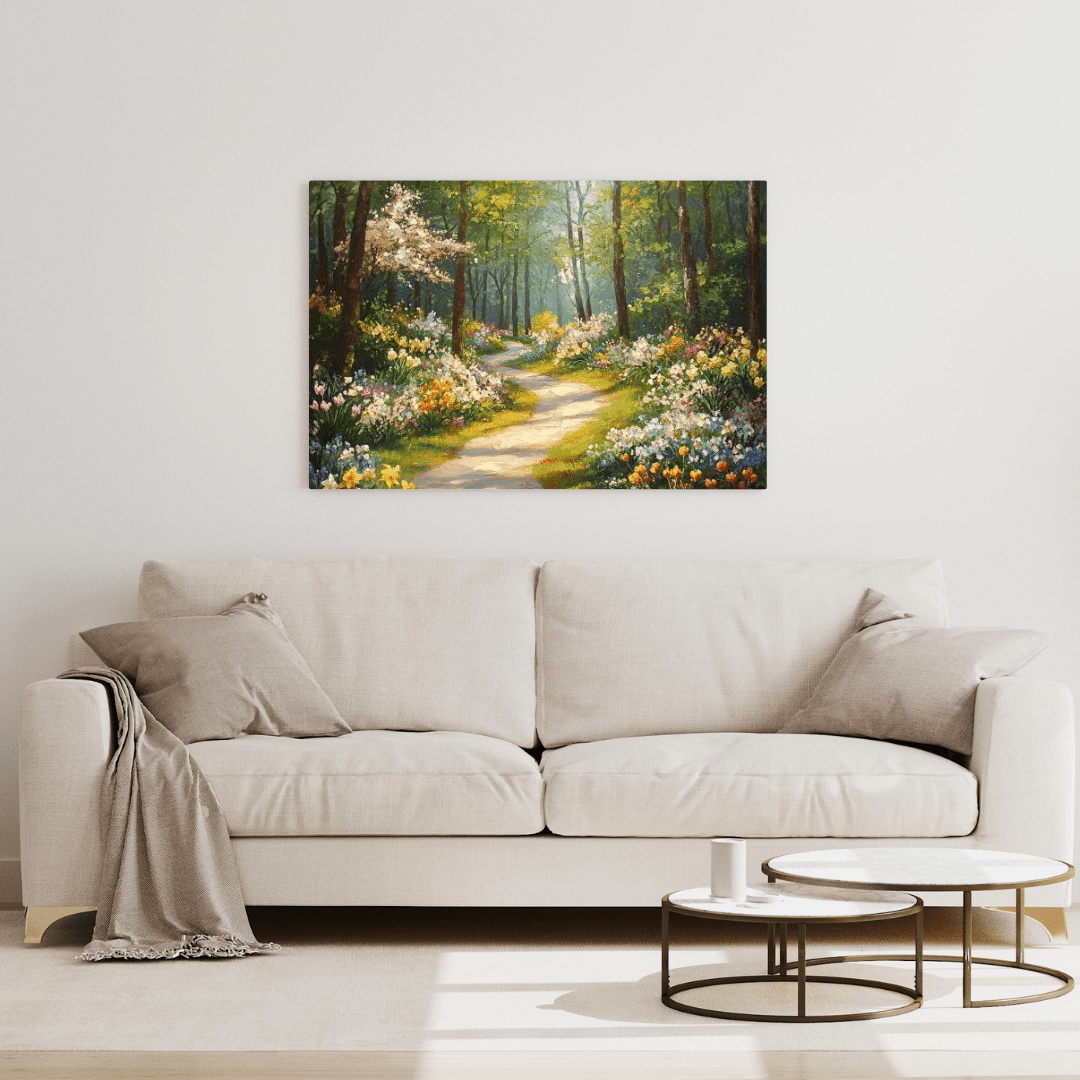 Whether you're looking to add a touch of nature to your living room or create a calming retreat in your bedroom, this stunning nature wall art makes a perfect addition. Embrace the tranquil charm of spring in your space with this beautiful forest canvas print.